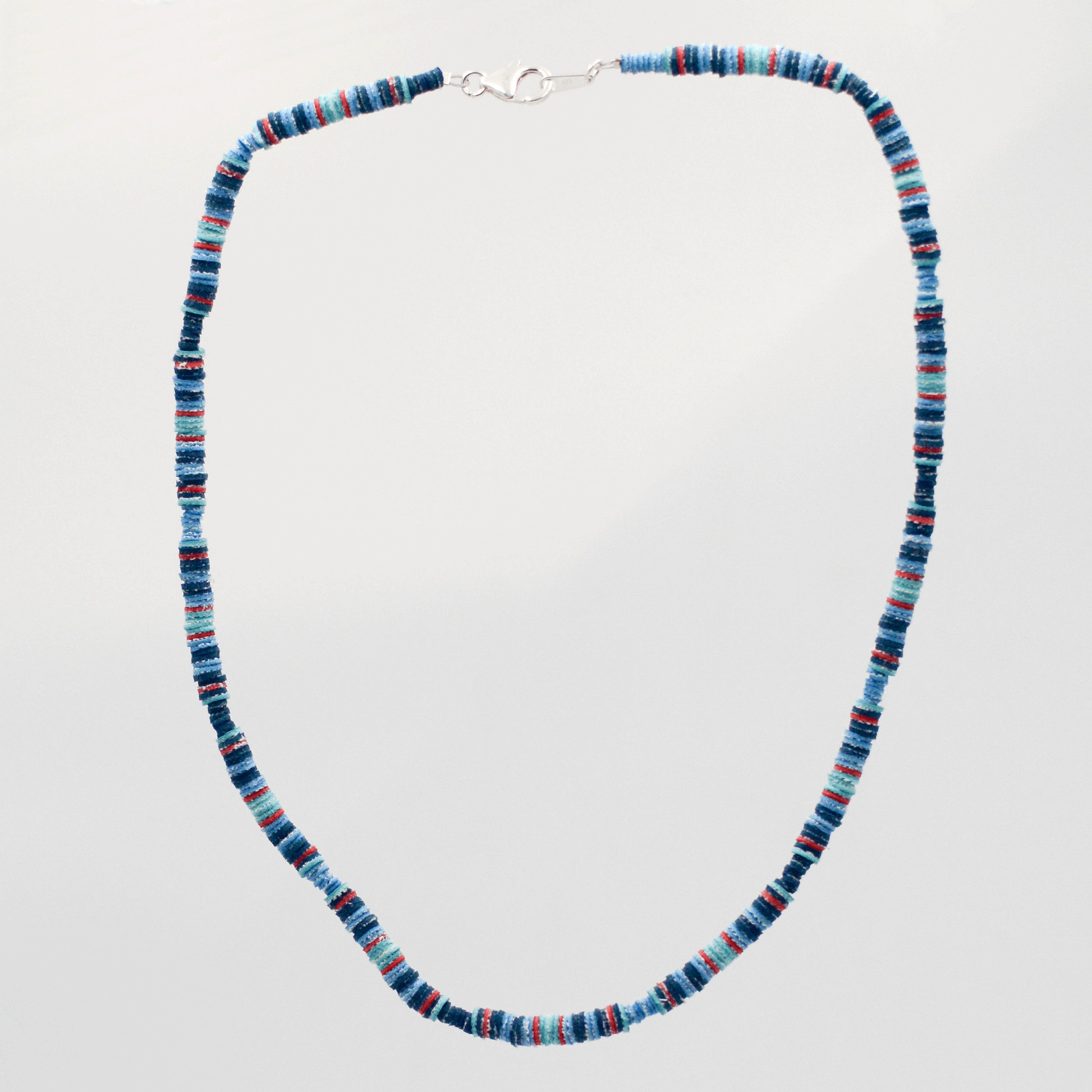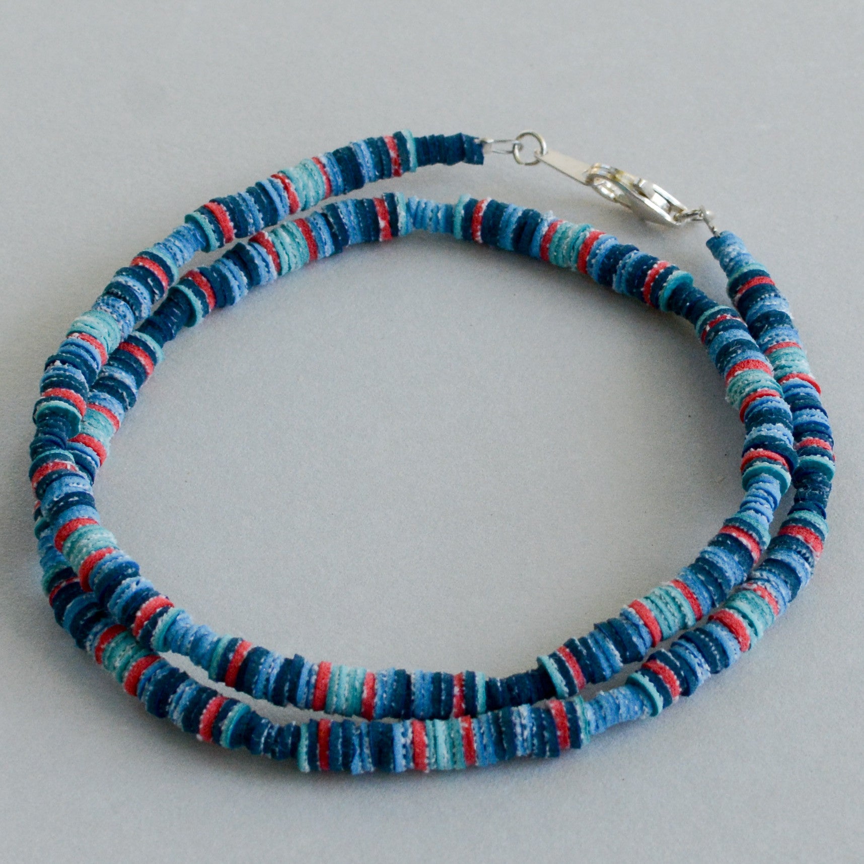 Colors: Made with dark sea foam, dark blue, aqua, light blue, turquoise, red, and red sparkle vinyl beads.